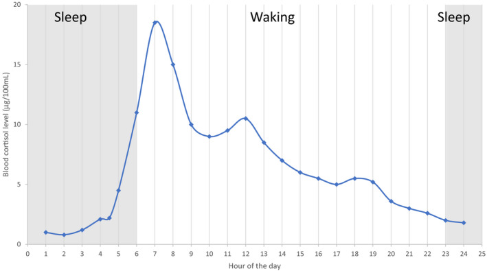 Le cortisol commence à être sécrété en fin de nuit pour atteindre un pic en début de matinée. Il décline ensuite progressivement durant la journée pour atteindre son taux le plus bas durant la nuit.