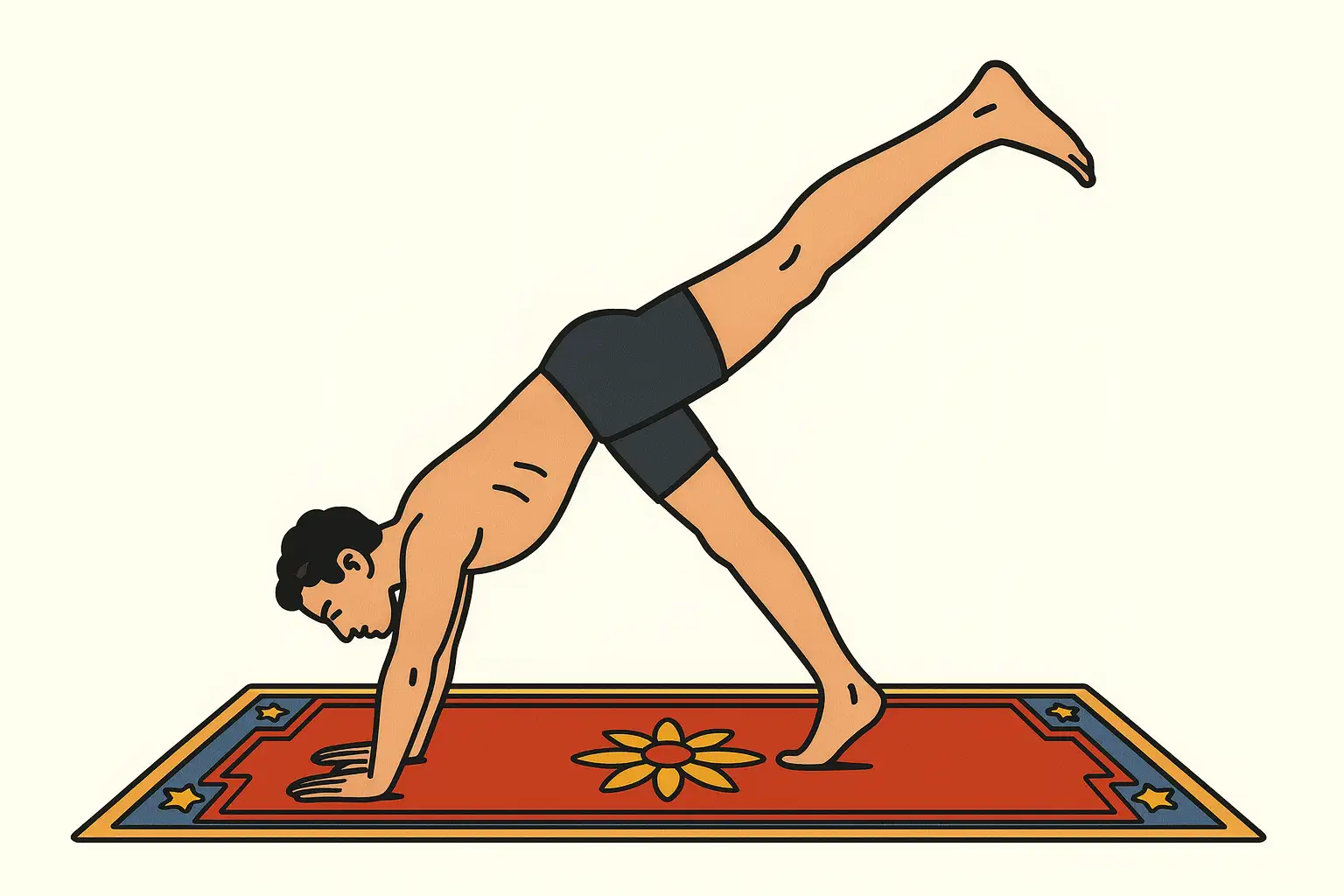 | Chien tête en bas à une jambe (Eka Pada Adho Mukha Svanasana) | 20 sec / jambe | 2 par jambe | Bassin stable, obliques engagés |