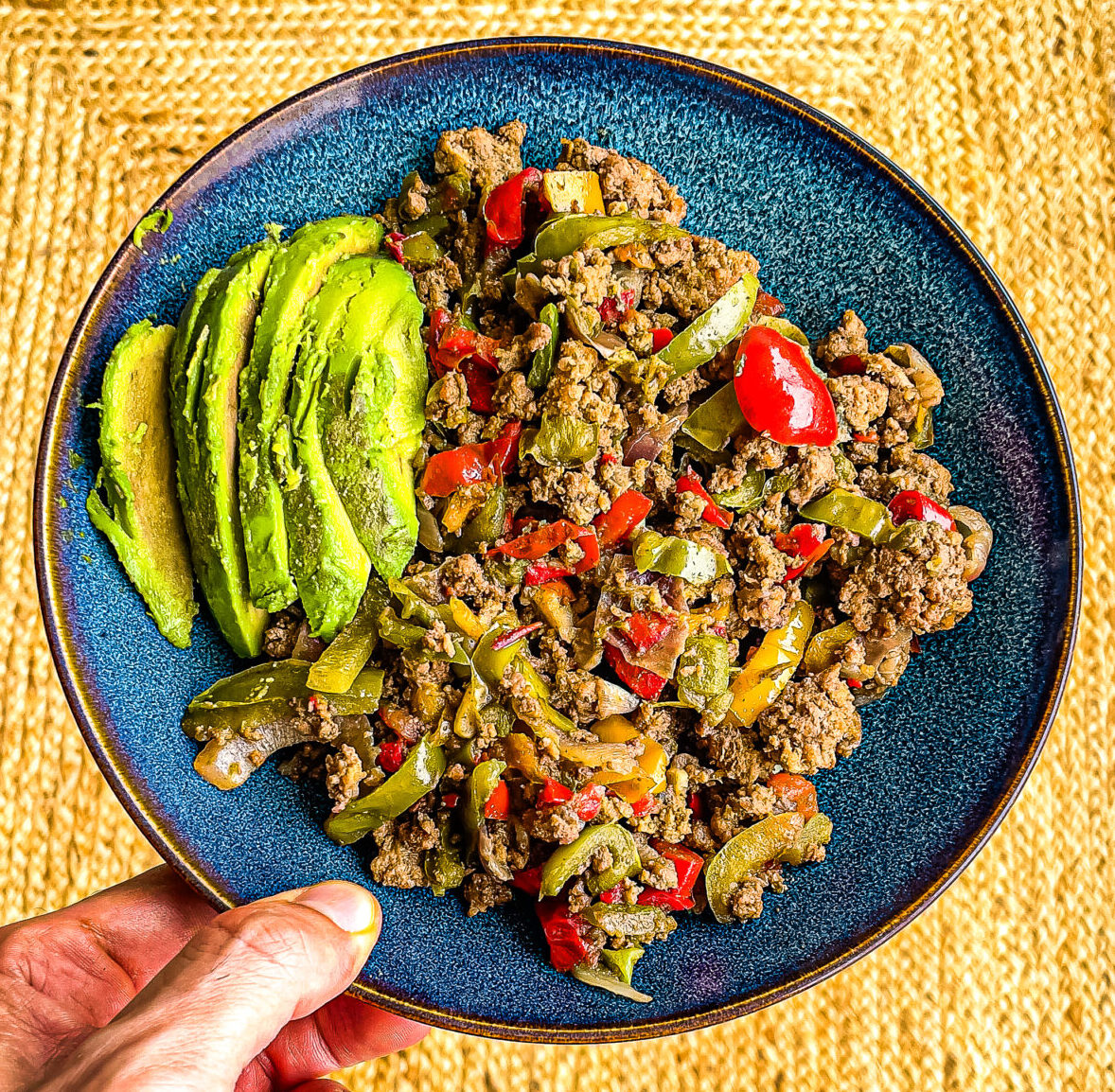 - Transférez le mélange de bœuf et poivrons dans une assiette. Coupez l’avocat en fines lamelles et disposez-le sur le côté.