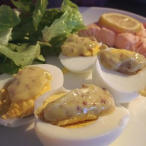 Version originale : retirer un peu de jaune cuit et le mélanger à la mayonnaise puis déposer le mélange sur les demi œufs dans votre assiette