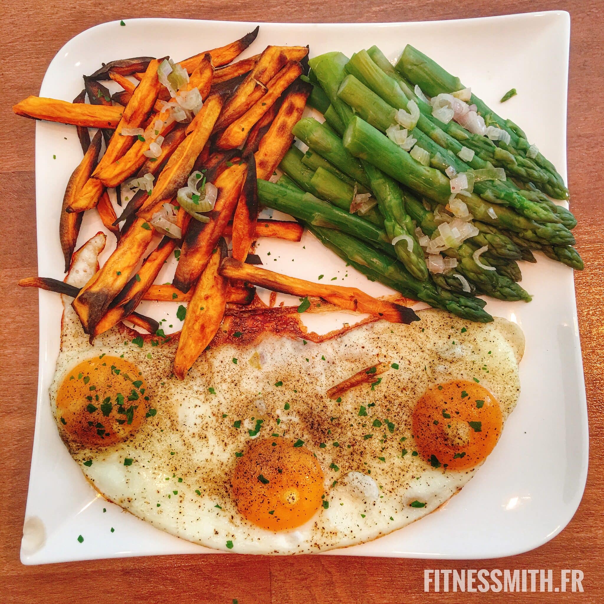 Par exemple, dans mon assiette ci-dessous, vous retrouvez des patates douces, des œufs et des asperges. Donc, des protéines, des glucides, des fibres et des graisses dans un bon ratio. ( voir mes recettes ici )